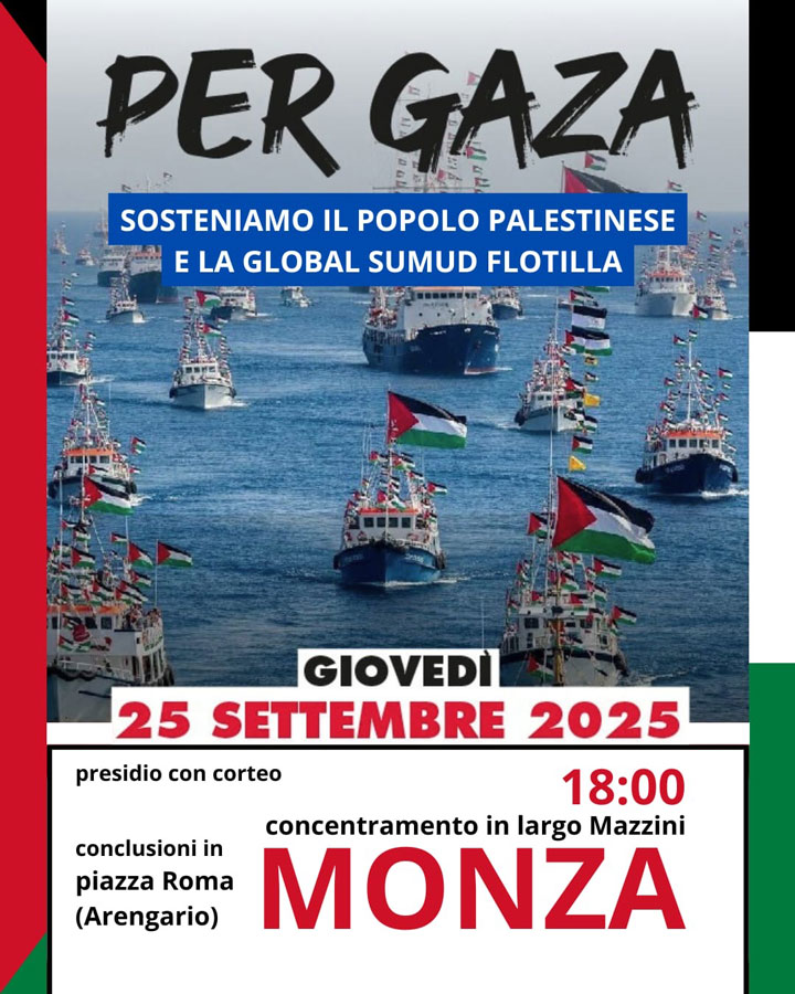 Per queste ragioni continuiamo a chiedere al governo italiano di adoperarsi per far sì che gli aiuti alimentari vengano consegnati alla popolazione di Gaza e per garantire la sicurezza della Global Sumud Flotilla, di riconoscere immediatamente lo Stato di Palestina e perseguire la soluzione dei due popoli e due Stati, ottenere il rilascio degli ostaggi e dei prigionieri politici, di interrompere ogni accordo militare e commerciale con il governo di Israele e di agire seguendo il diritto internazionale affinchè siano garantiti corridoi umanitari."