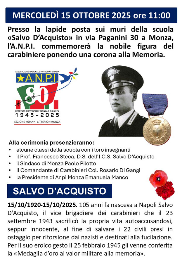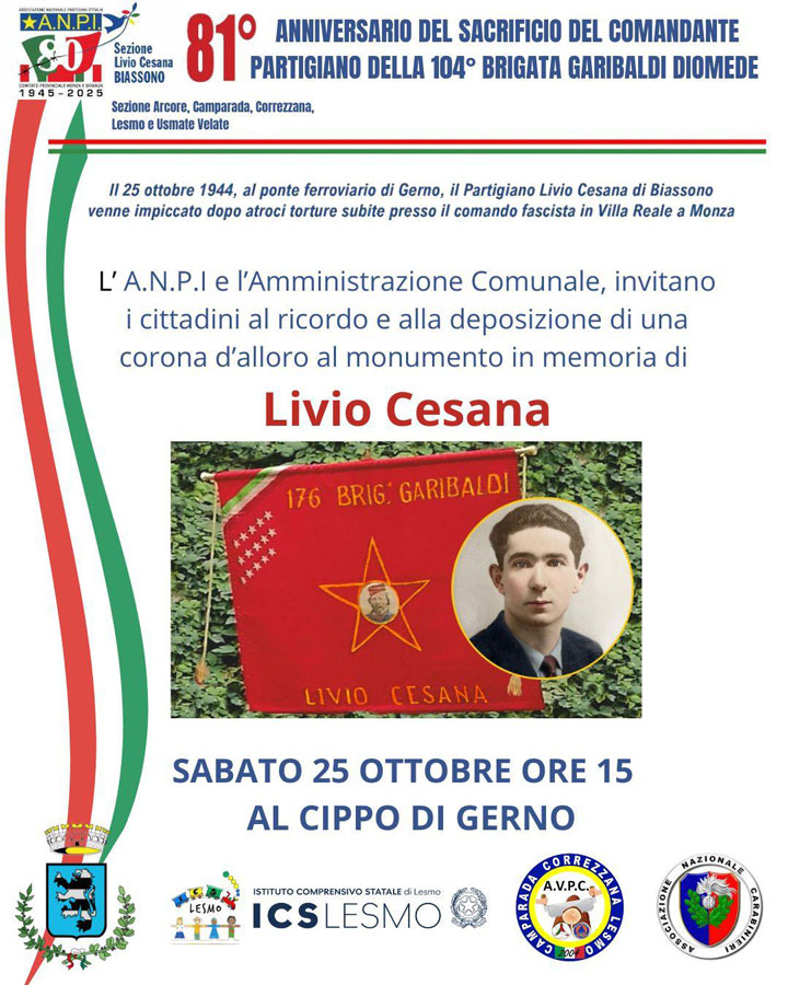 Sabato 25 ottobre alle ore 15 parteciperemo con ANPI Biassono e Comune Di Lesmo alla celebrazione in ricordo del Comandante Partigiano Livio Cesana di Biassono.