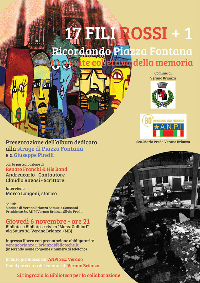 Il 6 novembre 2025 alle ore 21, presso la Sala Civica c/o la Bibloioteca di Verano Brianza, ricordiamo la strage di Piazza Fontana ascoltando brani cantati e recitati, raccolti nell'album "17 fili rossi + 1" , con la partecipazione di
