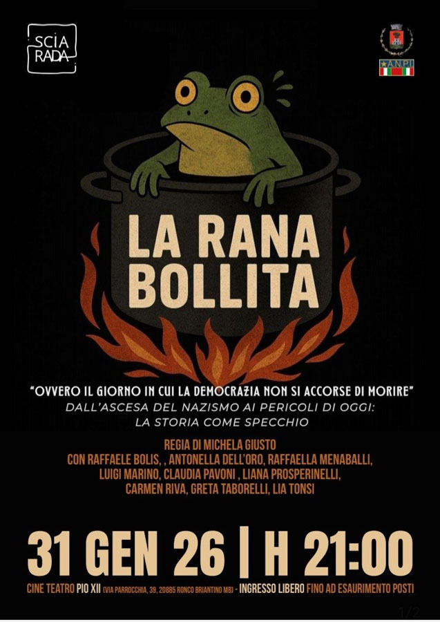 In occasione della celebrazione della Giornata della Memoria 2026, abbiamo il piacere di trasmettervi la locandina di uno spettacolo teatrale dal titolo "LA RANA BOLLITA, OVVERO IL GIORNO IN CUI LA DEMOCRAZIA NON SI ACCORSE DI MORIRE", dall'ascesa del Nazismo ai pericoli di oggi, la storia come specchio.