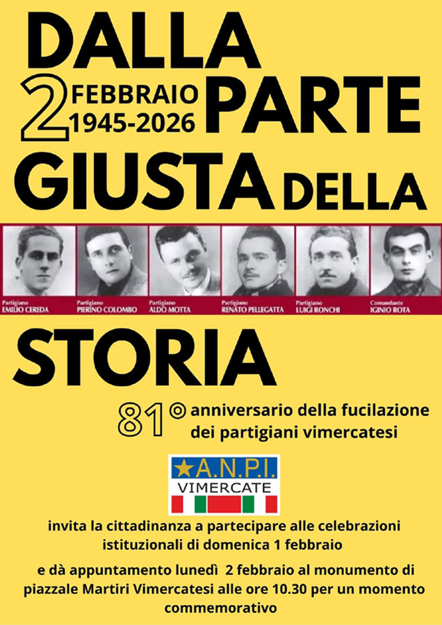Nell'81° anniversario della fucilazione dei giovani partigiani vimercatesi la nostra città, medaglia d'argento al merito civile per la resistenza rinnova il suo impegno antifascista per la difesa della democrazia e della libertà conquistata. Ricordare questo loro sacrificio è un dovere.