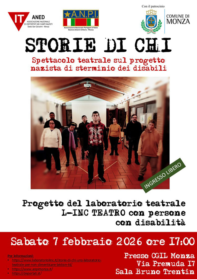 7 febbraio h 17 presso la sala Bruno Trentin della Cgil Monza Brianza (Via Premuda, 17) ci sarà una rappresentazione teatrale dal titolo "Storie di chi" a cura del laboratorio L-inc Teatro, che rielabora i tragici eventi dello sterminio nazista delle persone con disabilità (progetto Aktion T4) tra il 1933 e il 1945.