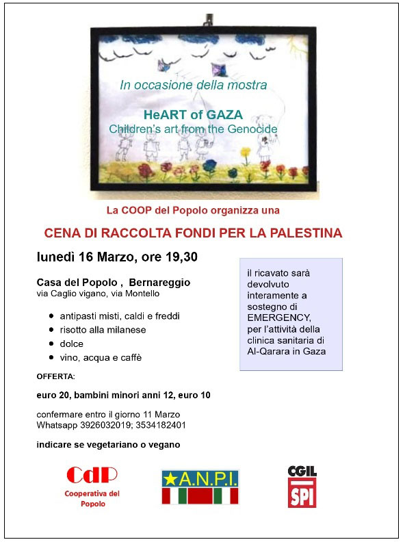 In occasione della mostra, la sera del 16 Marzo alla Casa del Popolo di Bernareggio si terrà una CENA DI RACCOLTA FONDI PER LA PALESTINA.