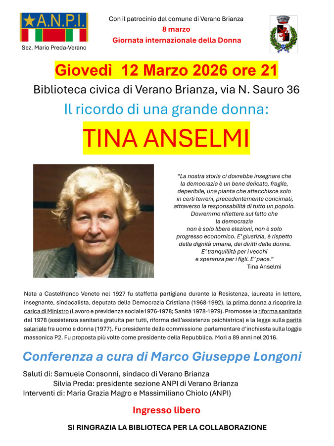 Verano Brianza: "Il ricordo di una grande donna: TINA ANSELMI"